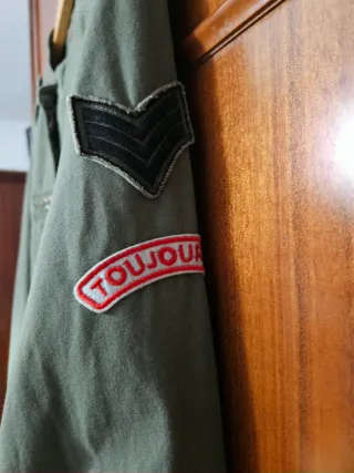 Cazadora de estilo militar con detalles únicos. - Cuello redondo. - Cierre de cremallera. - Dos bolsillos en el pecho con tachuelas. - Dos bolsillos inferiores. - Parche decorativo en la manga.