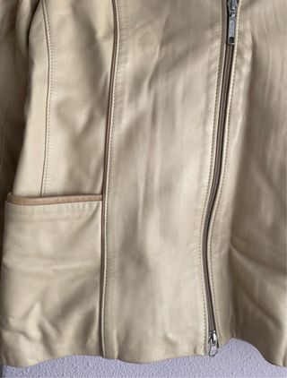 Cazadora de piel de la marca DyApell en color beige. - Diseño clásico con cuello. - Cierre de cremallera frontal. - Dos bolsillos delanteros con solapa. Piel de ovino Dyapell para El Corte Inglés 51 de axila a axila y 55 la parte inferior