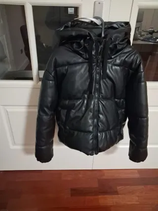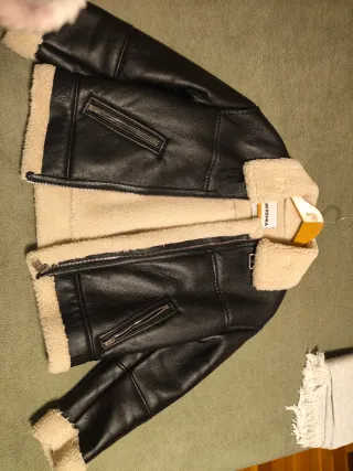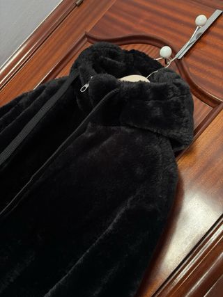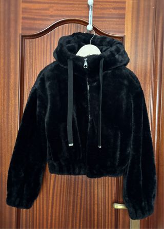 Cazadora de efecto pelo con capucha, ideal para un look moderno y abrigado. Solo usada una vez. - Diseño con capucha. - Cierre de cremallera. - Puños y bajo elásticos.