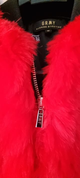 ☆Cazadora estilo bomber con un diseño de tres colores. La parte de la espalda está escrito en la escritura devanagari o hindi. ☆Colores: ● El rojo no es tan fuerte o chillón como se muestra en las fotos, sale así por la camara● -Cuerpo principal rojo, mangas blancas y negras. -Cuello en negro. -Puños y cintura elásticos en negro con franjas blancas. Con dos bolsillos. Cremallera frontal. ☆Material: Pelo sintético. No lleva etiqueta interior. Muy suave y confortable. Para un look moderno en días fríos. Totalmente forrada. Nueva sin etiquetas. Nunca usada. Talla M. Es amplia. Si tienes dudas preguntame antes de comprar.