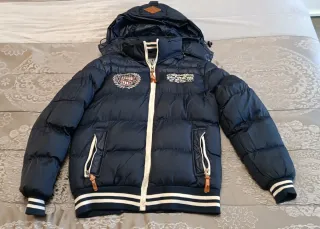 Cazadora acolchada de color azul marino. Presenta un diseño moderno y detalles que la hacen única. - Cierre de cremallera frontal. - Bolsillos laterales con cremallera. - Puños y bajo con banda elástica y rayas. - Capucha integrada.