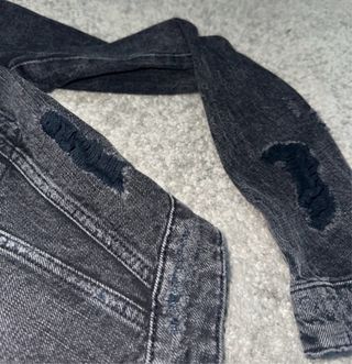 Cazadora vaquera con un estilo moderno y desgastado. - Diseño con hombros abullonados. - Detalle de rotos en mangas y parte delantera. - Cierre de botones metálicos. - Dos bolsillos en el pecho con solapa. - Talla XS/S.
