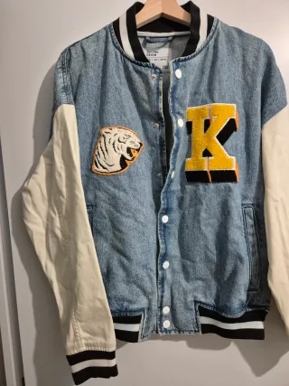 Cazadora estilo universitario con mangas blancas. - Cuerpo de denim azul. - Mangas de tejido blanco. - Cuello y puños con detalles de rayas. - Parche decorativo en el pecho. Se a usado muy poco