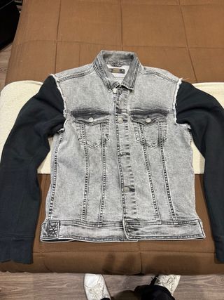 Cazadora vaquera con un diseño moderno y original. - Mangas de sudadera en contraste. - Lavado desgastado en la parte vaquera. - Cierre de botones metálicos. - Bolsillos en el pecho.