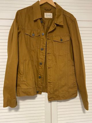 Cazadora estilo trucker de Pull & Bear en un original color camel/mostaza. Talla L (EUR L/MEX 40). Confeccionada en tejido de algodón resistente, cuenta con cierre de botones metálicos, dos bolsillos en el pecho con solapa y dos laterales. Incluye parche decorativo con el logo en la parte trasera inferior. Prenda muy versátil y en muy buen estado.