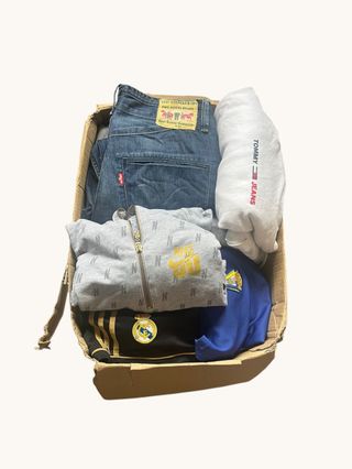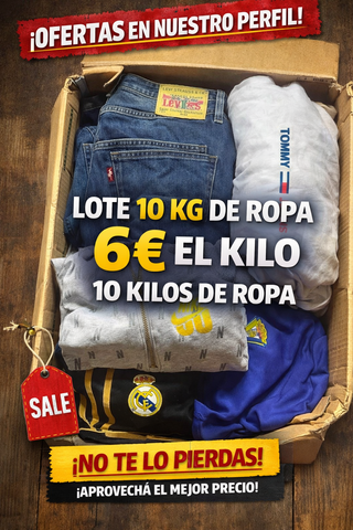Incluye algo más de 10 kilos de ropa vintage de grado B. Marcas variadas y 100% originales. Al ser prendas de grado B pueden incluir algun desperfecto, de ahi su precio. Incluye prendas variadas, vaqueros, cazadoras, polos, camisetas, sudaderas, etc... NO COMPRAR A 1€