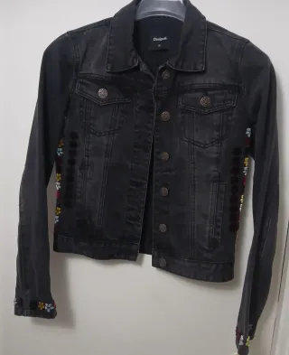 Cazadora vaquera de la marca Desigual con un diseño único. - Color base negro con detalles de flores. - Talla M (38/10).