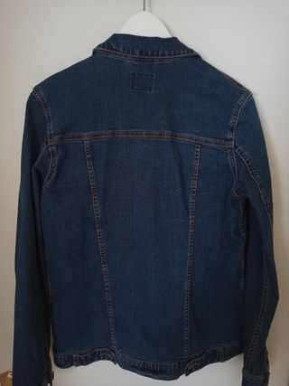 cazadora vaquera de la marca H&M, color azul claro , con tejido elástico, (elastan), marca talla 46, pero al ser ligeramente en talla de cortita más recomendable para una talla 44.