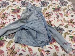 Cazadora vaquera marca TRF talla pequeña (S). se adjuntan medidas. tiene un trabon por la parte de abajo trasero que no se nota mucho. La cazadora por lo demás está en buen estado.