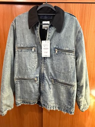 Cazadora vaquera de Zara con un diseño moderno y detalles únicos. - Color azul desgastado. - Cuello negro. - Múltiples bolsillos con cremallera. - Bajo deshilachado.