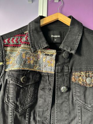 Cazadora vaquera de la marca Desigual con un diseño llamativo. - Color base negro con detalles en rojo. - Parches con la palabra LOVE y motivos de mariposas y rosas. - Tachuelas decorativas en cuello y bolsillos. - Puños con ojales metálicos y detalle de vivo rojo. - Debajo de ls axilas desgastadas.