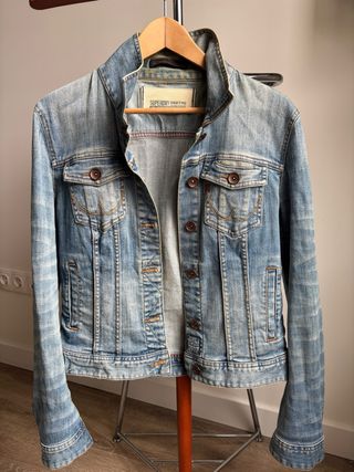 Cazadora vaquera de corte clasico, de la marca Superdry. El color es azul desgastado, lavado formando multiples rayas, por las zonas de mas color. Es entallada, con cuellos que permiten levantarse, tiene botones de cobre para cerrar la cazadora, bolsillos, puños y lateral. En total, tiene 6 bolsillos: dos arriba cerrados, dos en los laterales y dos grandes en el interior. Las medidas son: de hombro a hombro: 43 cm ancho en las sisas: 46 cm ancho en el bajo: 49 cm ancho en el corte encima de los bolsillos: 36 cm largo: 57 cm La prenda tiene bastante uso, pero sigue en buen estado. Precio original: 100 euros.