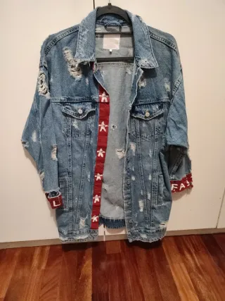 Cazadora vaquera de estilo oversize con detalles desgastados y un llamativo forro interior. - Diseño desgastado y con rotos. - Forro interior de tela roja con estampado de estrellas blancas. - Puños y bajo con detalles de cinta roja y letras blancas.