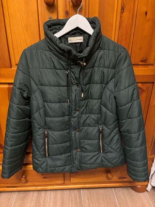 Cazadora acolchada de la marca Sfera en color verde. - Es una L pero talla como una M - Cuello alto ajustable - Cierre de cremallera y botones - Bolsillos laterales con cremallera