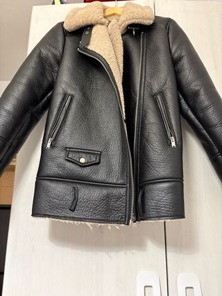 Cazadora estilo aviador de Stradivarius. - Diseño reversible. - Cuello de pelo sintético. - Cierre de cremallera. - Bolsillos con cremallera. Le falta el cinturón de abajo que no lo encuentro