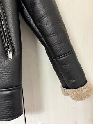 Cazadora de efecto ante con forro interior de borreguito. Válida para tallas S y M, como nueva. - Cierre de cremallera. - Bolsillos laterales con cremallera. - Cuello solapa con forro. NO NEGOCIABLE