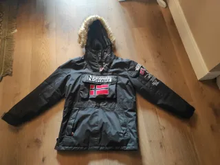 Cazadora estilo anorak de Geographical Norway. - Diseño con capucha y pelo. - Bolsillo frontal tipo canguro. - Detalles de parches y estampados. - Cierre de cremallera parcial. Sólo habría que darle unas puntadas dentro de los bolsillos. Lo demás está impecable.