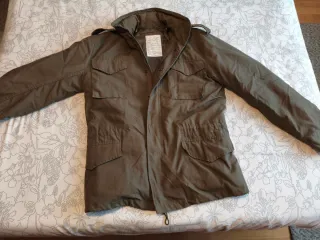 Cazadora estilo militar M65 en color verde. Diseño clásico y funcional. - Cuatro bolsillos frontales con solapa. - Forro cortavientos desmontable - Cierre de cremallera y botones. - Cintura ajustable con cordón. - Cuello alto con capucha oculta.
