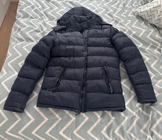 Cazadora acolchada de color azul. - Diseño con capucha. - Cremalleras en los bolsillos laterales. - Cierre de botones a presión.