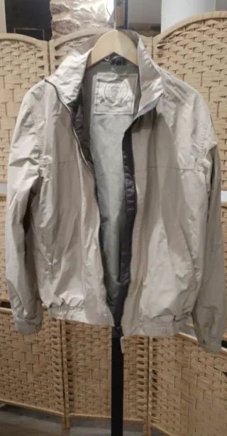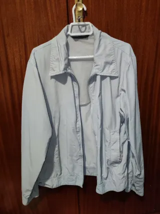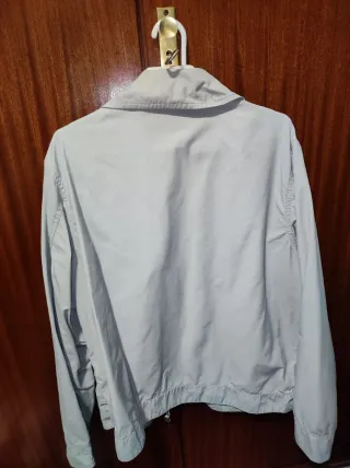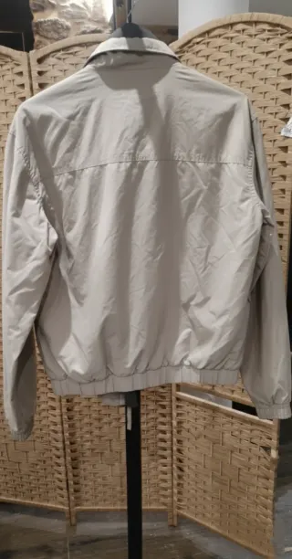 Cazadora ligera tipo cortavientos para hombre, talla M ideal para primavera y otoño. Color gris claro, con cierre de cremallera, cuello clásico y bolsillos laterales. Perfecta para un look casual y urbano. Muy cómoda y versátil, en buen estado.