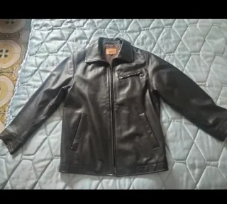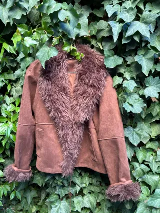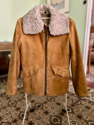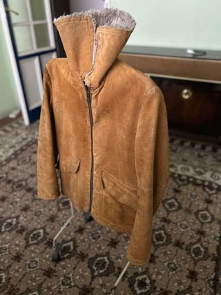 Cazadora vintage original (años 70) de piel auténtica marrón, con forro interior completo de borrego natural. Prenda muy abrigada, robusta y pensada para durar, con cuero grueso y resistente típico de la época (no es cuero blando moderno). Cuenta con cuello alto de pico, que puede llevarse subido o bajado, aportando un estilo clásico tipo aviador / utilitario. Estado: bueno para su antigüedad. El borrego está en buen estado general; la zona del cuello presenta oscurecimiento por polvo. No son manchas de grasa ni des - Material exterior: Piel. - Forro interior: Borrego. - Cierre de cremallera. En perfecto estado