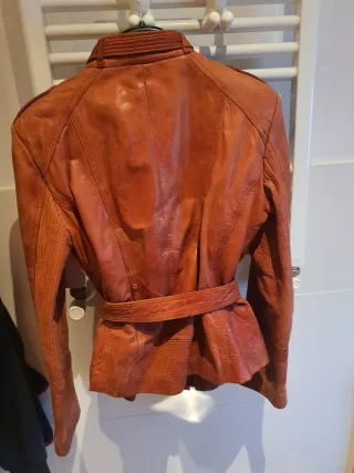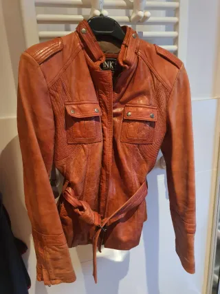 Cazadora de cuero para mujer con un diseño moderno y elegante. - Material: Cuero - Color: Marrón y naranja - Diseño con cinturón - Bolsillos frontales con solapa - Cuello alto - Hombros con detalle - Puños ajustados