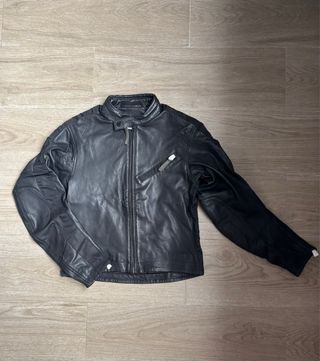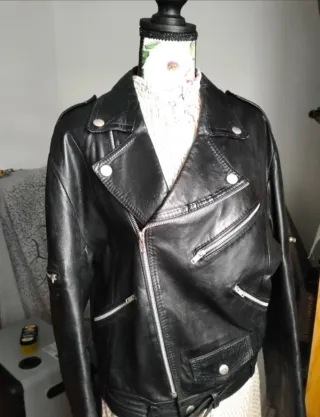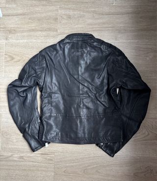 Cazadora estilo motero, ideal para entretiempo. Es una prenda nueva, sin estrenar. - Diseño clásico de motera. - Cierre de cremallera frontal. - Bolsillos con cremallera. - Puños con cremallera. - Cinturón ajustable.