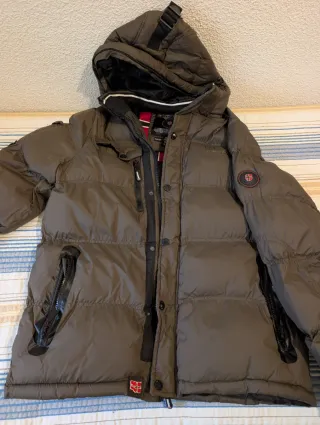 Cazadora de plumas Geographical Norway en color marrón. Diseño acolchado y capucha. - Cierre de cremallera frontal. - Bolsillos laterales con cremallera. - Detalle de logo en manga.,puesto una vez