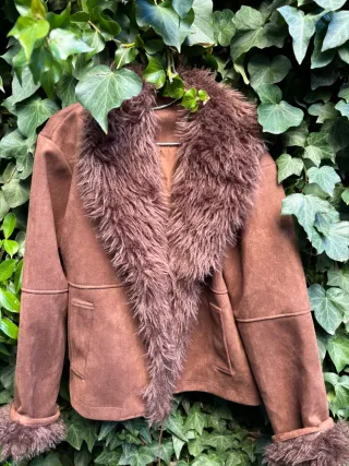 Cazadora de pelo sintético en tono marrón. Suave y cálida. - Diseño de pelo largo. - Cuello clásico.