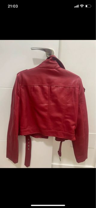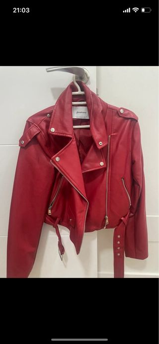 Cazadora de polipiel en color rojo. - Diseño tipo biker. - Cinturón ajustable en la parte inferior. - Cierre de cremallera.