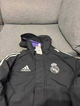 Cazadora oficial del Real Madrid. - Diseño acolchado. - Capucha integrada. - Cierre de cremallera. - Puños ajustables con velcro.