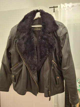 Cazadora de piel con un diseño moderno y abrigado. - Cuello y forro interior de pelo sintético. - Cierre de cremallera y botones. - Bolsillos frontales.