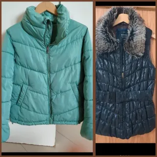 Conjunto de dos cazadoras, una en color verde menta y otra en marron - Cazadora acolchada verde con cuello alto.stradivarius - Chaleco acolchado con cinturón y cuello de pelo.la cremallera aves sube aveses no pero no esta rota Las 2 por el mismo precio!! Solo hago envios!!