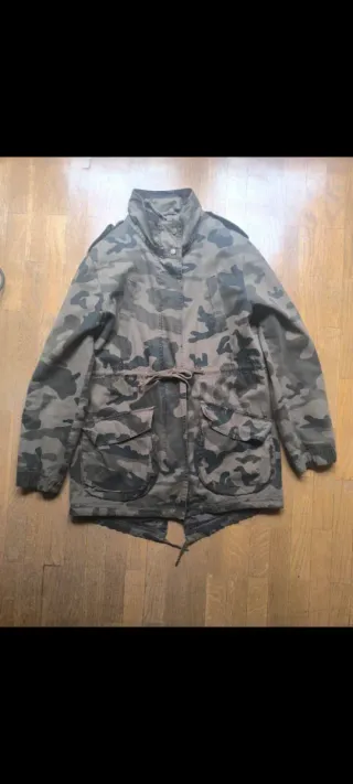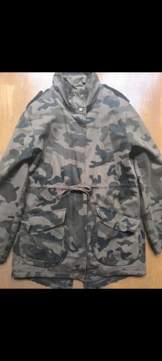 Cazadora estilo militar con estampado de camuflaje. - Diseño con cuello alto. - Cierre de cremallera y botones. - Dos bolsillos delanteros. - Cintura ajustable con cordón. - Muy original y con muy poco uso.