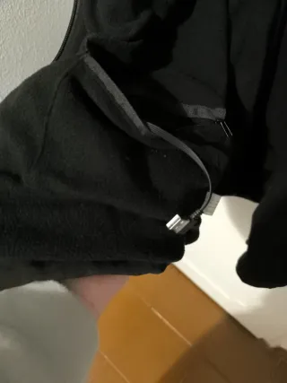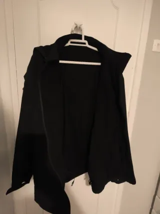 Cazadora negra calefactable para conectar a una batería externa de 10000 (no incluida),con zonas en espalda y delantera, cremallera sellada frontal, Al igual que los bolsillos. Repelente a la lluvia. Interior forro polar, con capucha, con opción a quitar. En perfecto estado. - Diseño moderno y funcional. - Tejido suave al tacto.
