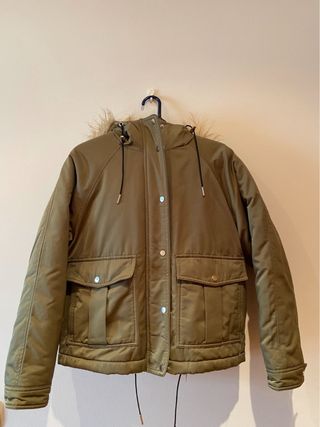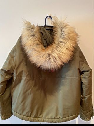 Cazadora con capucha de Bershka en color verde militar. Impecable. El pelo de la capucha se puede sacar. Perfecta para el día a día. Muy caliente, cómoda y ligera. - Cierre de cremallera y broches - Dos bolsillos delanteros con solapa. - Capucha con cordones ajustables. - Detalle de pelo en la capucha que se puede sacar Inditex invierno frío lluvia coat capoto anorak rain anorak abrigo trenza parla viento urge chollo Zara rebaja oportunidad fondo armario colegio adolescente pull mango Stradivarius plumas sintético