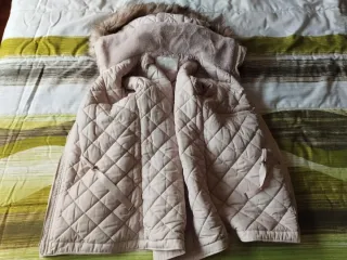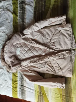 Cazadora larga casi sin uso. - Color beige. - Diseño acolchado. - Capucha integrada. - Cierre de botones a presión. - Posibilidad de hacerla chaleco muy facilmente. - Muy calentita.