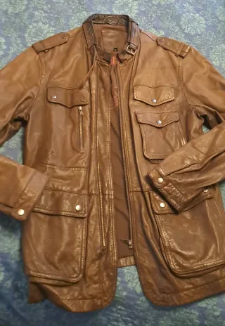 Cazadora de piel de color marrón. Presenta un diseño Vintage con múltiples bolsillos. Cierre de cremallera. Cuello alto con hebilla. Bolsillos con solapa y cremallera. Puños ajustables con botones. Tiene muchos años que le da un aspecto vintage único.
