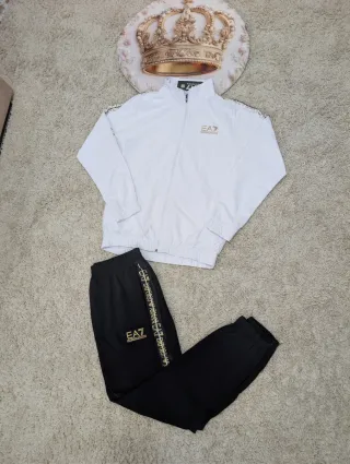 Conjunto deportivo de dos piezas con detalles dorados. - Chaqueta con cremallera completa. - Pantalón con cintura elástica. - Diseño con logo EA7 en dorado.