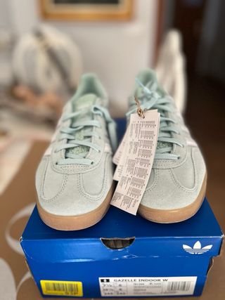NUEVAS: Zapatillas Adidas Gazelle en color Ash Green. Ideales para un estilo casual y cómodo. - Parte superior de ante. - Detalle de las tres rayas blancas. - Suela de goma. - Cierre con cordones.