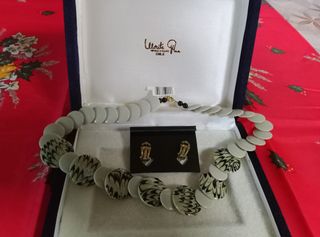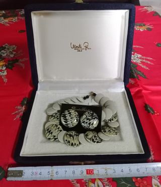 Conjunto de un precioso collar y pendientes hechos a mano de la marca Morita Gil, presentado en su estuche original. Nunca ha sido usado por lo que las joyas están como nuevas pero el estuche tiene manchitas amarillas debido al paso del tiempo. - Precioso diseño artesanal en beige y negro con detalles brillantes en tonos plata y oro.