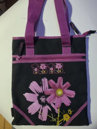Bolso de hombro con un diseño llamativo de flores. - Dos cremalleras frontales. - Asas de tela resistentes. - Detalle de flores rosas y número 1818 en la parte frontal.