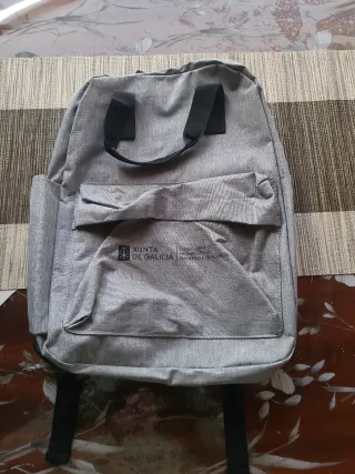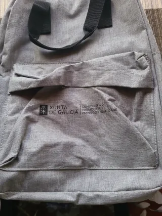 Mochila de color gris con un diseño moderno y práctico. - Compartimento principal espacioso. - Bolsillo frontal con cierre. - Asas acolchadas ajustables. - Logo de Xunta de Galicia en el frontal.