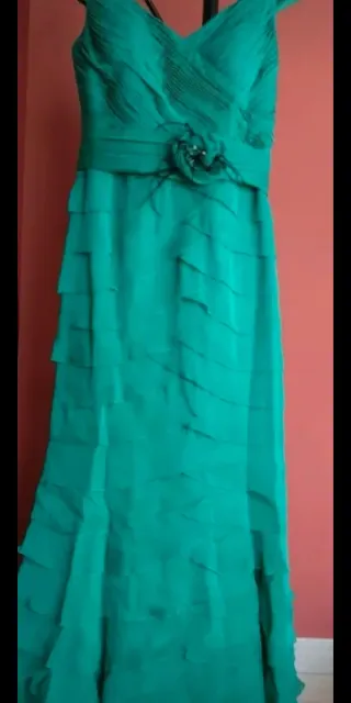 Elegante vestido largo en un bonito tono verde azulado. Ideal para eventos especiales. - Diseño con escote en V. - Adorno floral en la cintura. - Falda con capas de volantes.