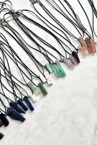 Lote de 28 collares hechos a mano con piedras naturales en forma vertical e irregular. Incluyen cordón negro clásico con cierre metálico (excepto un par que son marrones con nudo corredizo). Cada uno es único. Minerales: - Cuarzo Fresa (4 un). - Cuarzo Rosa (2 un). - Amatista (3 un). - Aguamarina (1 un). - Amazonita (3 un). - Cuarzo Verde (2 un). - Howlita Blanca (2 un). - Lapislázuli (5 un). - Cuarzo Ahumado (2 un). - Ojo de tigre / Ojo de halcón (4 un). Se vende el lote completo (No se venden por separado). Comprando este lote sale a 1,25€/u.