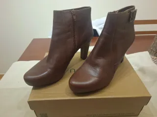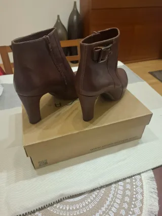 Botines de piel en color marrón. - Diseño de caña corta. - Tacón grueso. - Cierre de cremallera lateral.