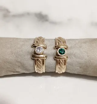 Conjunto de anillos con un diseño elegante y detalles en oro. - Tallas 12- 14 - 15 - 17 - 18,5 - Fabricados en Gold Filled. - Cada anillo presenta una piedra central de color verde, rojo y azul. - Diseño con detalles texturizados y un acabado brillante.