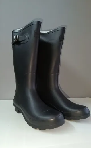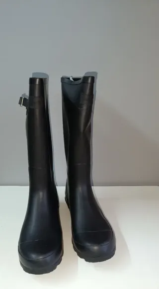 Botas de agua altas de color negro. Perfectas para días de lluvia o actividades al aire libre. - Diseño clásico y funcional. - Hebilla decorativa en el lateral.