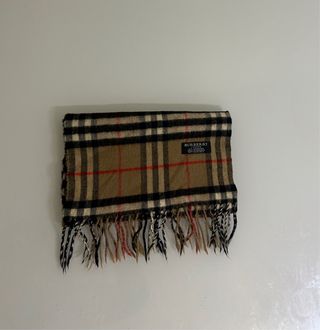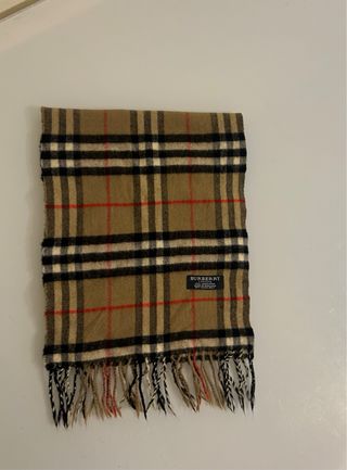 Bufanda clásica de Burberry con el icónico diseño tartán. - Diseño a cuadros en tonos rojos, negros y blancos. - Acabado con flecos en los extremos. - Material suave y cálido.