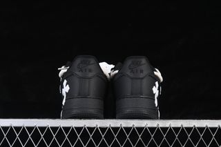 Zapatillas Nike Air Force 1 Low personalizadas con un diseño inspirado en Chrome Hearts. Combinan el negro clásico con detalles blancos. - Cordones blancos gruesos. - Adornos metálicos con forma de cruz y cadena. - Diseño de cruz blanca en la puntera. - talla 36 a 45